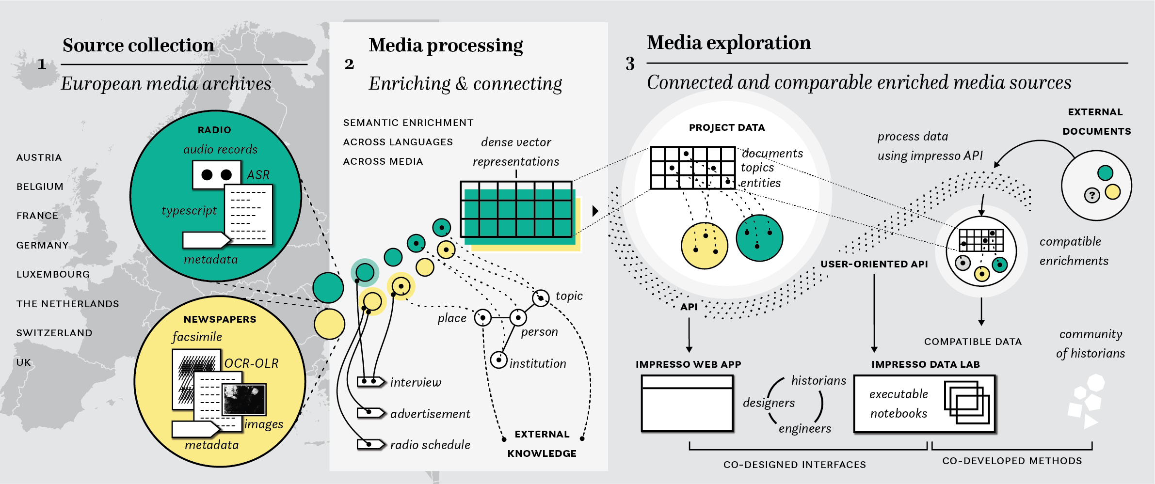 Impresso seeks to transcend language and media barriers to enable, for the first time, the joint exploration of a vast corpus comprising both newspaper and radio archives. This initiative spans different modalities, time periods, languages, and national boundaries. Our objective extends beyond simply aggregating collections and enabling full-text search capabilities. We aim to enhance and interconnect these sources by implementing multiple layers of advanced semantic enrichments, all represented within a unified, multilingual vector space. Additionally, our goal is to develop robust, meaningful, and transparent exploration tools specifically tailored for historical research.